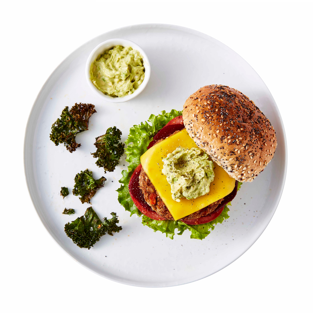 3 To assemble, spread the base and top of bun with avocado mayonnaise. Top with two Hydro lettuce leaves, overlapping to form frill right around the bun. Top with tomato, beetroot, lentil patty and dollop avocado mayonnaise and parsley leaves. Top with burger lid. Serves with kale chip.